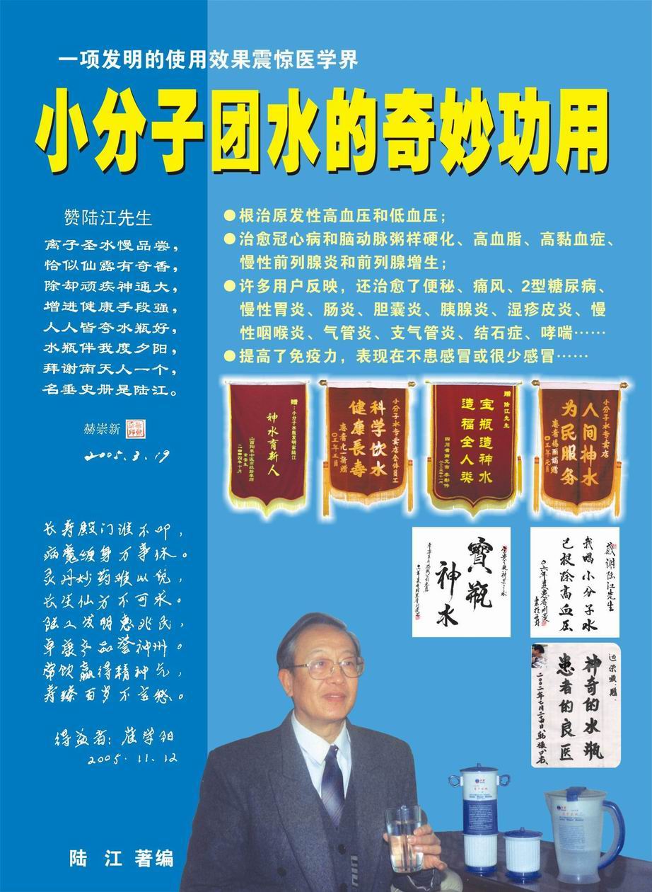 人類幾千年來患以上病癥需終生服藥,幾十年也不能治愈。可是我國南寧的高級(jí)工程師陸 江,于1990年想根治高血壓,研究發(fā)明了離子水瓶,處理出微小分子團(tuán)水供飲用,經(jīng)過醫(yī)院臨床試用和專家鑒定,1999年獲中國發(fā)明專利權(quán),產(chǎn)品于2000年投放市場(chǎng)后一直跟蹤調(diào)查,據(jù)全國各地用戶反饋:祛除了高低血壓、糖尿病和冠心病,并使前列腺增生、咽喉炎、鼻竇炎、慢性氣管炎、支氣管炎、矽肺病、哮喘、慢性胃炎、腸炎、慢性膽囊炎、慢性腎炎、腎衰、膀胱炎、便秘、痔瘡、風(fēng)濕性關(guān)節(jié)炎和濕疹皮炎及中風(fēng)后遺癥等病癥不藥而愈。為什么喝微小水能治20多種病?陸 江從1991年德國科學(xué)家發(fā)現(xiàn)細(xì)胞膜水通道僅為2納米獲得啟發(fā),認(rèn)為多種器官患病是因細(xì)胞脫水,不能正常代謝和分裂增殖,才使器官細(xì)胞減少致衰弱萎縮而形成細(xì)胞缺水性病癥。22年來的實(shí)踐有力地支持了“細(xì)胞脫水致病”這一重要論點(diǎn),表明喝微小水可滿足細(xì)胞的生理需求,補(bǔ)水就能祛病,是生命科學(xué)新亮點(diǎn)。